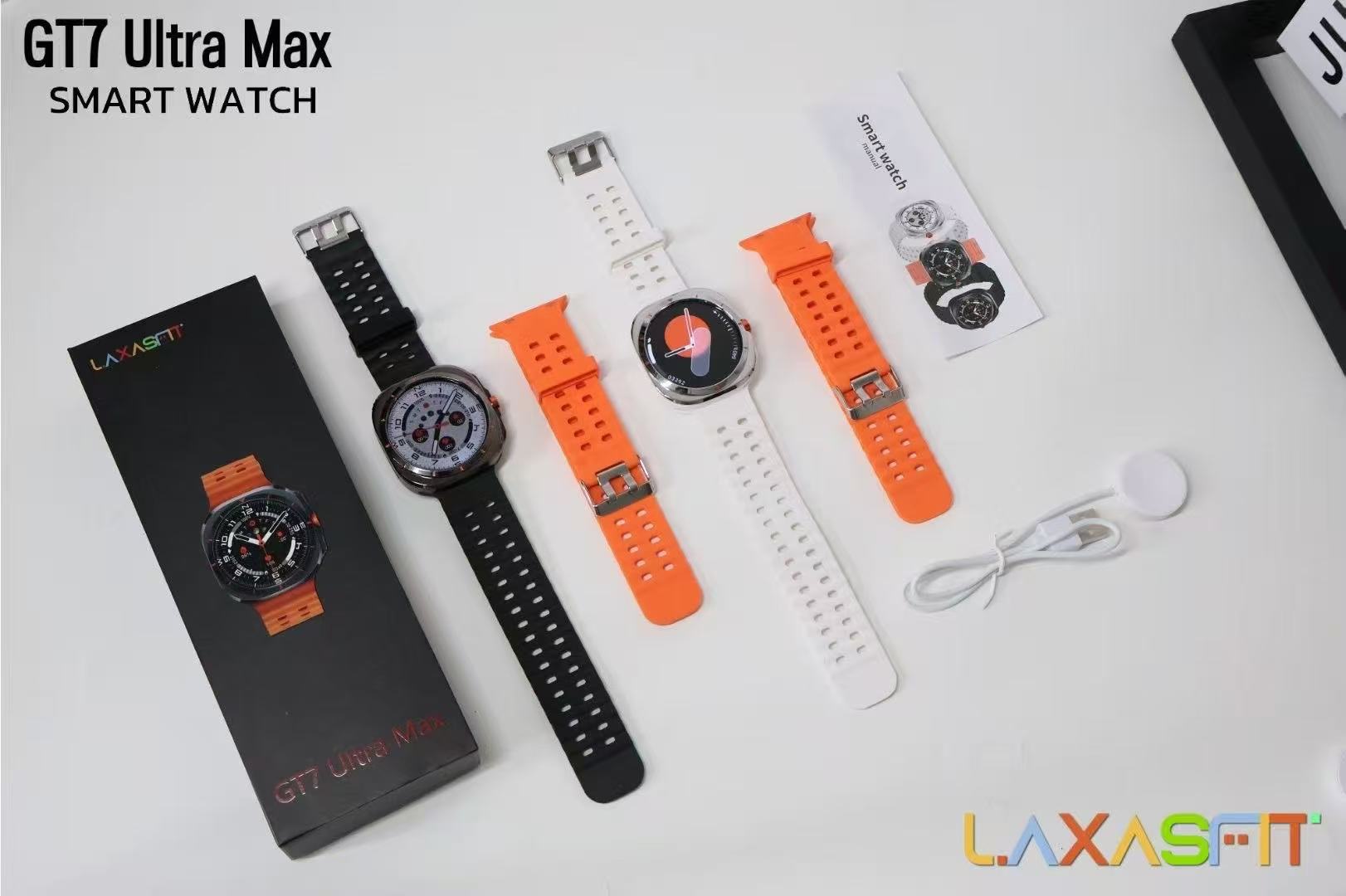 LAXASFIT GT7 Ultra Max Smart Watch – Key Features: 1.9/2.0 inch HD Display Bluetooth Calling Support Heart Rate, Blood Oxygen, and Sleep Monitoring Multi-Sports Mode Water-Resistant (IP67/IP68) Long Battery Backup (2–5 days) Notification Alerts (Calls, Messages, Social Apps) Extra Colorful Strap & Charging Cable