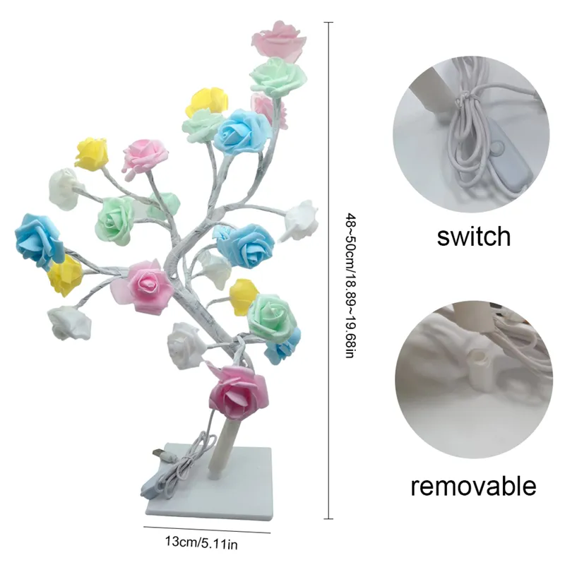 Lighted colorful LED flower lamp for your home?Bonsai style design, one led rose lamp has 24 LEDS,and small tree lights have led tree lights. Satisfied table decoration?This lights suitable for birthday, wedding, party, Valentine's Day, Thanksgiving, Christmas, New Year and Easter, can be placed in led lamps for home decoration, office, bedroom, balcony, restaurant, porch, etc. USB or Battery Powered?it can be powered through runs on 3 AA batteries (not included) so it is convenient for you to place it wherever you like; you can also connect it to computers, laptops, phone chargers, power banks and other devices via 2M USB cable (include). 5V safety charger(not include)and controlled with an ON/OFF switch on the battery box, Attention: just choose one mode when you use. DIY for customized shape?You can twist and shape every branch on the tree to design the position of your lovely rose tree lamp, injecting your personal style into the table lamp and having fun. Perfect gift for any occasion?A wonderful gift for Thanksgiving, Christmas, Valentine's Day, Birthdays, Graduations, Weddings, and Anniversaries.